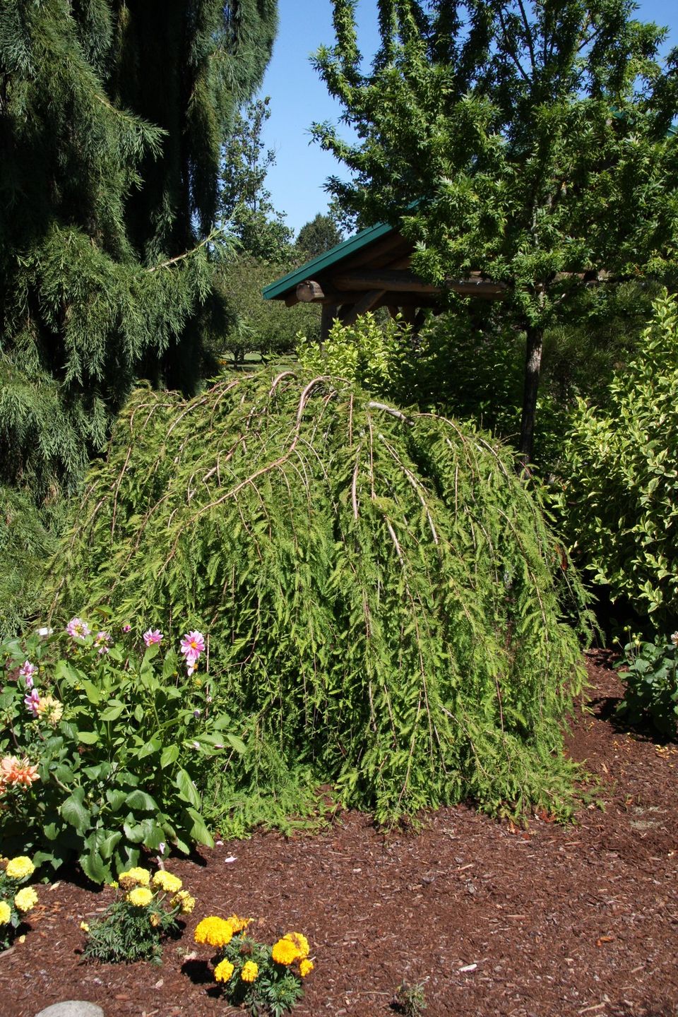 Description: Taxodium dis Cascade Falls is an elegant deciduous conifer with gracefully arching, weeping branches covered with red shaggy bark on the trunk, and fine grass-green leaves which turn bronze in autumn before falling.