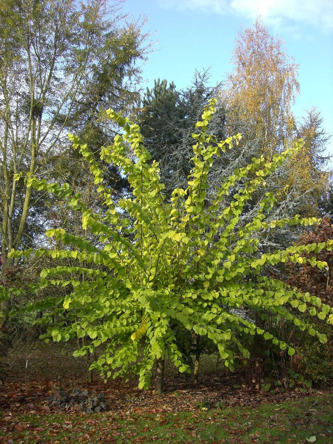 A narrowly conical tree. Broad crinkled edged leaves are suffused yellow. Height after 10yrs up to 6m.